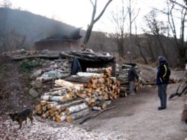 Miközben az asszony az itt égetett mészkő jó tulajdonságairól beszél, a gazda ölfa méretűre — méteresre — szabdalt fával eteti a tüzet. Nyers fával, tapasztalatból is tudom — gyermekkoromban még a szénégetésnél is segédkeztem gépész apámnak, aki elég sok kovácsszenet használt —, hogy magas hőfokon a víz vegyi elemeire bomlik, és maga is az égést táplálja.