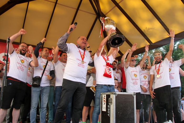 Ezt követően a résztvevők tapsa és éneklése közepette a csapat és a szakmai stáb tagjait egyenként szólították színpadra, végül együtt emelték magasba a mintegy 12 kilós, ezüst-kupát, de nem maradt el az afféle Kárpát-medencei magyar sporthimnusszá vált Nélküled és a székely himnusz közös elénekelése sem. Az est – avagy az éjjel – pedig ezzel sem ért véget: a székelyudvarhelyi Transylvanium együttes koncertje során régi slágerek csendültek fel, sötétedés után pedig tűzijáték jelezte égen-földön: Román Kupa-győztes Sepsiszentgyörgy focicsapata.