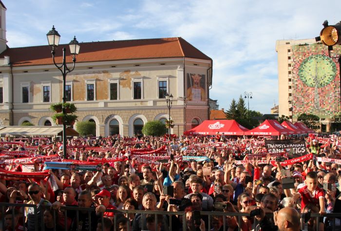 Több ezren gyűltek össze péntek este Sepsiszentgyörgy főterén, hogy a Román Kupa-győztes Sepsi OSK labdarúgócsapat sikerét ünnepeljék. A kora nyári napsütés és a trófea csillogása, no meg a kedvencekkel való találkozás lehetősége nem csak az elkötelezett szurkolókat vonzotta ki a központba, teljes családok érkeztek, idősebbek, fiatalok együtt töltötték meg teret, miközben a gyermekek vagy szüleik nyakában, vagy különféle emelvényekre kapaszkodva igyekeztek minél többet elkapni az afféle „fiestává” alakuló örömünnepből.