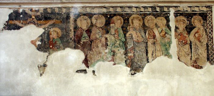 A mellékhajó déli hosszfalát további 15. századi falfestmények díszítik, amelyek közül kiemeljük a Keresztre feszítés képet és a Madonnát körülálló hét női védőszent kompozícióját.