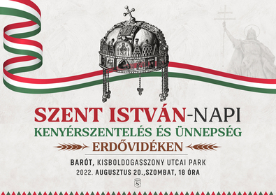 BARÓT. A város önkormányzata augusztus 20-án, szombaton 18 órától második alkalommal szervez Szent István-napi ünnepséget Baróton a Millenniumi emlékmű közelében, a Kisboldogasszony utcai parkban. A részletes program: 18 órától ünnepi műsor: Juhászné Bérces Anikó: Fohász Szent István királyhoz című költeményét előadja Kovács Koppány, a sepsiszentgyörgyi Székely Mikó Kollégium IX. osztályos baróti diákja; kórusművek a felsőrákosi hagyományőrző dalcsoport előadásában: Nemzeti dal, Él a magyar, Hálát adok; köszöntőt mond Benedek-Huszár János, Barót város polgármestere; Ó, Szent István, dicsértessél – csángó népdalt ad elő Sebestyén Fruzsina, a sepsiszentgyörgyi Mikes Kelemen Elméleti Líceum IX. osztályos köpeci diákja; köszöntőt mond Udzeliné Murányi Enikő, Balaton község (Magyarország) polgármestere; népdalokat énekel Pap Franciska, a balatoni küldöttség tagja; fohászt mond ft. György Imre baróti római katolikus segédlelkész; egyházi énekek a baróti Szent Adalbert Kórus előadásában: Ah, hol vagy, magyarok tündöklő csillaga?, Igaz hitnek plántálója; ft. György Imre baróti római katolikus segédlelkész megáldja a felsőrákosi Szőcs Zsófia által sütött kenyereket; ünnepélyes kenyérszegés és -szétosztás; koszorúzás a Millenniumi emlékműnél; komolyzenei koncert a Csíki Kamarazenekar előadásában, műsoron Bartók Béla, Weiner Leó, Kodály Zoltán és Hubay Jenő művei, magyar és székely himnusz.