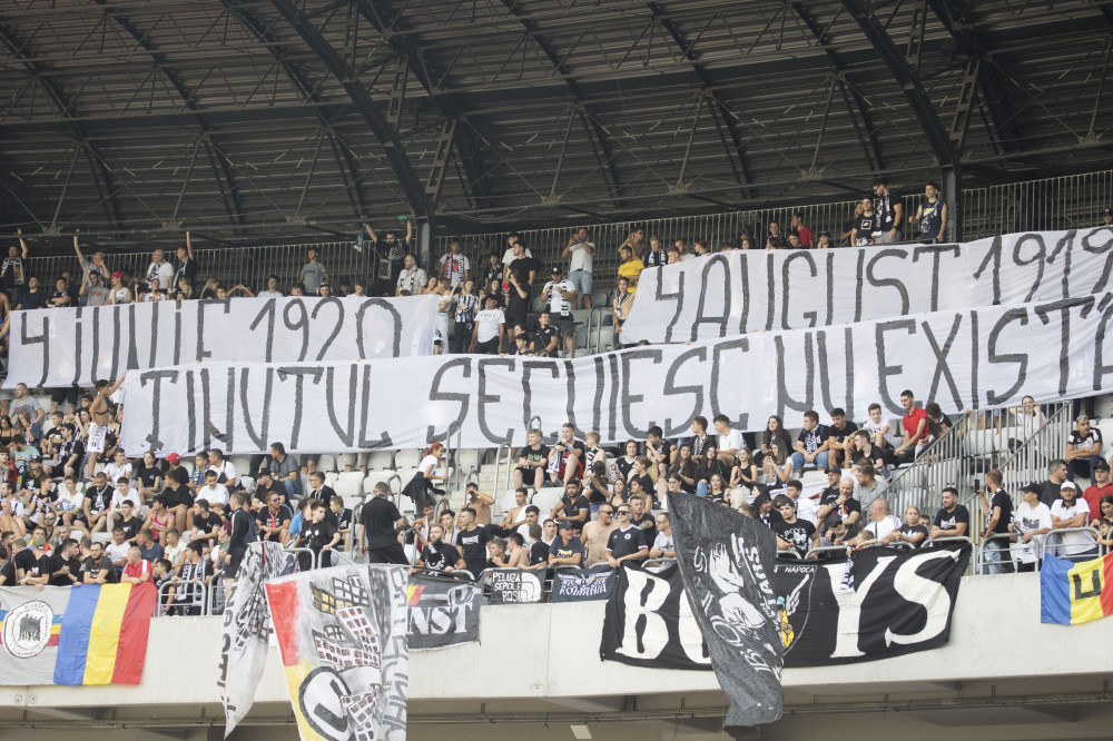Az ultrák újabb transzparenseken fogalmazták meg mondandójukat: „A trianoni szerződés egy szent dokumentum, amely tanúsítja földjeink határait”, továbbá: „Amiként a Nagy-Magyarországról és Székelyföldről szőtt álmokat el kell fojtani, úgy a horthysta csapatokat, a Sepsiszentgyörgyöt, a Csíkszeredát és a Székelyudvarhelyt is le kell törölni a futball térképéről.”