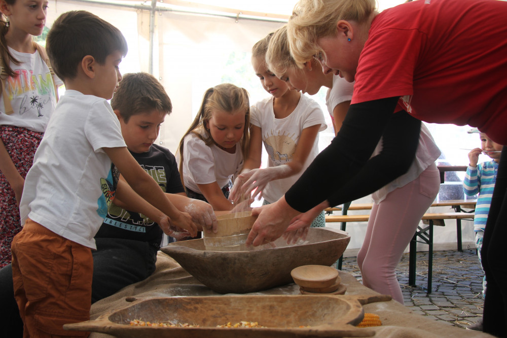 Miközben a csapatok dolgoztak, a korzón felállított nagy sátor alatt is kezdetét vette a munka, a megyei művelődési központ és a kisbaconi Bodvaj Egyesület együttműködése révén idén két napon át működött a kürtőskalácssütő kismesterek tanodája. Mint a helyszínen kiderült, nemcsak a gyermekek, de a felnőttek is szívesen bekapcsolódtak a foglalkozásokba, melyekre Benedek Elek Mese a kalászról című történetével hangoltak a szervezők, majd gabonaszemeket válogattak és őröltek jelképesen a kisbaconi vízimalom makettjén a gyermekek, végül a hófehér abrosszal leterített asztal mellett tekerték dorongokra az olvasztott vajjal, citromhéjjal ízesített kelt tésztát. Kellett ugyan némi türelem, míg a parázs fölött végül kalács lett a tésztából, de érdemes volt kitartóan forgatni a dorongokat, hiszen mindenki magával vihette saját kürtőskalácsát, sőt, még oklevelet is kapott.