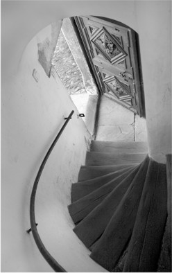 De látunk udvarteret belülről kitekintve is (Nagy Lajos), a kiállított fotók által pedig beléphetünk a súlyos ajtókon, megszemlélve előbb a kovácsoltvas vasazatokat (Hlavathy Károly), korlátokat, tornácokat, a tetők, cserepek játékát, a beugró ablakmélyedések ívelt vonalait, beléphetünk a lépcsőházakba, cipőinkkel képzeletben kopoghatunk a félkörben kanyarodó falépcsőkön, és eljátszhatunk a felemelkedésnek olyszerű lehetőségével, mint ahogy azt Kovács László Attila is tette, amikor úgy kapta lencsevégre a fentről lefelé, a nyitott ajtó irányába kanyarodó lépcsősort, hogy az tulajdonképp nem is lefelé vezet, hanem fölfelé, a tárt ajtó irányába, talán a szűkös térből a fény, a szabadság, a szabadulás felé.