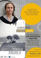ÍRÓ-OLVASÓ TALÁLKOZÓ. A magyar kultúra napja alkalmából szervezett körútján Tompa Andrea kolozsvári születésű, jelenleg Budapesten élő író január 26-án, csütörtökön 18 órától Sepsiszentgyörgyön a Bod Péter Megyei Könyvtár Gábor Áron-termében találkozik az olvasókkal. A szerzővel Pieldner Judit irodalomtörténész beszélget.
