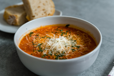 Hozzávalók: 1 zeller, 40 dkg paradicsom, 1 liter paradicsomlé, 1 fej fehérhagyma, 1 kiskanál oregánó (szurokfű) és bazsalikom, 1 dl olaj; 3 mozzarellagolyó, reszelt parmezán a tálaláshoz.