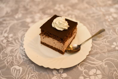 A kihűlt piskótát lapjára kettévágjuk, az egyik felét tálcára fektetjük, rákenjük a kakaós-rumos tejszínhabot, majd a másik lappal befedjük. A tortabevonót az olajjal gőz felett összeolvasztjuk, egyenletesen elkenjük a sütemény tetején, majd hűtőbe tesszük, amíg a máz a tetején megdermed. Kockára vágva, a tetején tejszínhabrózsával tálaljuk.