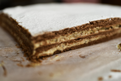 Az első lapot tálcára tesszük, megkenjük a krém felével, rátesszük a második lapot, rásimítjuk a maradék krémet és beborítjuk a harmadik lappal. Az így összeállított süteményt néhány órát pihentetjük, majd a tetejét porcukorral megszórva, hosszúkás szeletekre vágva tálaljuk.