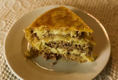 Végül a lisztből a tojásokkal és pici sóval laskatésztát gyúrunk, kinyújtjuk, majd egy olajjal kikent lábosba terítjük úgy, hogy a szélei az edény oldalán lelógjanak. Az így előkészített edénybe rétegeljük a korábban elkészített hozzávalókat. Alul párolt káposztát terítünk, rászórjuk a kifőtt laskát, befedjük a darált húsos raguval, a rétegek között pedig megkenjük tejföllel. A rétegezést addig folytatjuk, amíg a hozzávalók elfogynak, a tetején az utolsó rétegnek káposztának kell lennie. Végül az edény oldalán lelógó levéllaskát ráhajtjuk a káposztára, a tetejét megkenjük olajjal, majd 180 Celsius-fokra hevített sütőben kb. egy óra alatt pirosra sütjük.