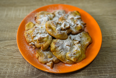 Hozzávalók: 7,5 dl tej, 40 dkg liszt, 4 nagy alma, csipetnyi só, csipetnyi fahéj, 1 tojás; olaj a sütéshez; porcukor a tetejére.