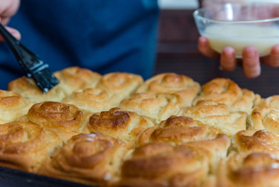 Elkészítése: A lisztet egy tálba szitáljuk, a közepébe mélyedést képezünk, belemorzsoljuk az élesztőt, rászórjuk a cukrot, és ráöntünk kb. 1 dl langyos tejet, összekeverjük, kevés lisztet szórunk rá, és letakarva felfuttatjuk az élesztőt. Ezután hozzáadjuk a tojásokat, a zsírt, a citrom reszelt héját, a sót, a maradék langyos tejet, és összegyúrjuk – tiszta konyharuhával letakarva, meleg helyen fél órát kelesztjük. Eközben a vajat habosra kavarjuk a cukorral. Amikor a tészta megkelt, két cipóra osztjuk. A cipókat rendre fél centi vastagra nyújtjuk, rákenjük a habosra kavart vajat, rászórjuk a mazsolát, szorosan felcsavarjuk, és kétujjnyi szeletekre vágjuk.