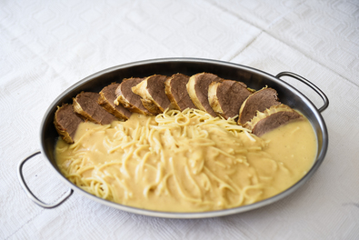 A húst lehártyázzuk, egészben sózzuk, borsozzuk, majd forró zsírban minden oldalát fehéredésig pirítjuk – felhasználásig félretesszük. Az edényben maradt zsiradékba beletesszük a karikára vágott hagymát, a feldarabolt zellert és a babérlevelet, majd rövid ideig lefedve együtt pároljuk. A zöldséges alapra ráfektetjük a körbepirított húst, felöntjük félliternyi vízzel, és továbbra is fedő alatt, lassú tűzön kb. 2 órát főzzük. Amikor a hús megpuhult, kivesszük, és kb. 1 cm vastagra szeleteljük. Ezután a babérlevelet kivesszük az edényből, a zöldségeket botmixerrel pépesítjük, felforraljuk, hozzáadjuk a tejfölt, összekavarjuk, majd citromlével, valamint sóval és borssal ízesítjük. A felszeletelt húst a zelleres mártással tálaljuk, köretnek melléje spagettit adunk.