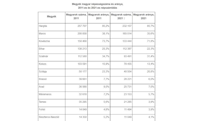Az RMDSZ táblázatai szerint két megyében nőtt a magyarság aránya a 2011-es népszámláláshoz képest: Hargita megyében 85,2 százalékról 85,7 százalékra (most is ez a „legmagyarabb” megye), Bákó megyében pedig 0,7-ről 0,9 százalékra. Minden más megyében csökkenés tapasztalható: Háromszéken (Kovászna megyében) például 73,7 százalékról 71,8 százalékra csökkent a magyar lakosság aránya, habár a két nagyobb városban nőtt: Sepsiszentgyörgyön 76,9-ről 78,1 százalékra, Kézdivásárhelyen 91,1-ről 92,5 százalékra. Maros megyében jelenleg 35,6 százalékos a magyarság aránya (2011-ben 38,1 volt), Bihar megyében 22,3 (25,3 volt), Szatmár megyében 31,4 (34,7 volt), Kolozs megyében 13,4 (15,9 volt), Szilágy megyében 20,8 (23,3 volt), Brassó megyében 6 (7,7 volt), Arad megyében 7 (9 volt), Máramarosban 5,7 (7,2 volt), Temes megyében 3,9 (5,6 volt), Fehér megyében szintén 3,9 (4,6 volt), Beszterce-Naszód megyében 4,1 (5,2 volt), Hunyad megyében 2,9 (4 volt), Szeben megyében 1,8 (2,9 volt), Krassó-Szörényben 0,7 (1,1 volt), a többi megyében összesen 0,6 (0,8 volt). Bukarestben stagnált a magyarság aránya: 0,2 százalék volt a 2011-es és a 2021-es népszámláláson is, ez azonban jóval kevesebb személyt jelent: tíz év alatt 3359-ről 2168-ra csökkent a magyarságukat fölvállaló fővárosi lakosok száma.