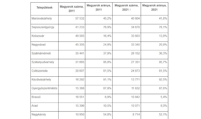 Sepsiszentgyörgy magyar közösségének létszáma most először haladta meg a kolozsváriét, s bár így is második helyen áll Marosvásárhely mögött, a legnagyobb magyar többségű város Romániában. Számokban ez a következőképpen néz ki: Marosvásárhelyen 40 604 magyar nemzetiségű lakos élt 2021 december elsején, az összlakosság 41,8 százaléka; Sepsiszentgyörgynek 34 678 magyar lakosa van, és ez a városban élők 78,1 százaléka (az összlétszám 50 080 fő). Megyénkben maradva: Kézdivásárhely 16 029 lakosa közül 13 771 magyar, Baróton 7658-ból 6736 (ez 95,8 százalékot jelent, egy tizeddel kevesebbet, mint 2011-ben), Kovásznán 9208-ból 5556 (ez 60,3 százalék, utóbbi már nem az RMDSZ közleményéből, hanem az országos összesítésből kiemelt adat).
