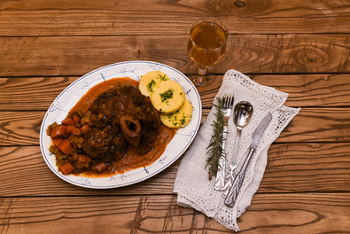 Elkészítése: A húst alaposan megmossuk, szárazra töröljük, sózzuk, borsozzuk, lisztbe mártjuk, majd egy nagy érclábosban forró olajon körbesütögetjük, kérgesítjük és kiszedjük. A maradék olajban előbb megdinszteljük az apróra vágott hagymát és a felkarikázott póréhagymát, majd hozzáadjuk a nagyobb hasábokra darabolt többi zöldséget is. A zöldséges-hagymás alapba beletesszük a fokhagymát, a babérlevelet, a kakukkfüvet, sózzuk és megszórjuk frissen őrölt feketeborssal, majd amikor a ragu kissé összeesett, hozzáöntjük a fehérbort és kiforraljuk. Ezután öntjük bele az alaplét, beletesszük a paradicsompürét és a húst, majd a lábost lefedve betesszük a sütőbe és 150 Celsius-fokon, alsó-felső sütési fokozaton legalább három órát sütjük. A sütési idő felénél megnézzük a húst, és annak függvényében, mennyire készült el, még rövidebb-hosszabb ideig visszatesszük a sütőbe. A húsnak puhának és omlósnak kell lennie, de csak annyira, hogy ne váljon el a csonttól!