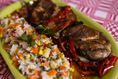 Hozzávalók: a juhpörkölthöz: 2 fej fehérhagyma, 1 vajpaprika, 2 paradicsom, 50 dkg juhhús, pirospaprika, só, 2 evőkanál zsír; a rizibizihez: 20 dkg zöldborsó, 20 dkg rizskása (rizs), 1 murok (sárgarépa), 15 dkg kukorica, 1 evőkanál vaj, csipetnyi petrezselyemzöld, só.