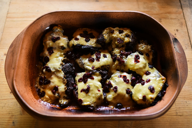 Elkészítése: A római tálat négy órával korábban beáztatjuk. Ezzel párhuzamosan a nyakkarajt felszeleteljük, sózzuk, borsozzuk, megszórjuk zúzott fokhagymával, és összeforgatjuk a korianderes olajjal – jól záródó edényben hűtőben tartjuk négy órán át. A bepácolt hússzeleteket belerakjuk a római tálba, ráöntjük a vörösbort, és lefedve betesszük a hevített kemencébe sülni bő egy órára. Ezalatt a gombát lereszeljük, sózzuk, borsozzuk és vajon megpároljuk, illetve a sajtot felszeleteljük. Kivesszük a kemencéből a római tálat, rákanalazzuk a hússzeletekre a párolt gombát, és mindegyikre teszünk egy szelet sajtot. A tálat fedő nélkül tesszük vissza ismét a kemencébe addig, amíg a sajt ráolvad a húsra. Ekkor ismét kivesszük, megszórjuk aszalt vörös áfonyával és még 5 percre visszatesszük, hogy az áfonya belesüllyedjen a sajtba. Az ínyenc fogást vajas, petrezselymes krumplival tálaljuk.