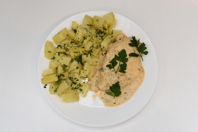 A tejszínes csirkemellet natúr pityókával tálaljuk.