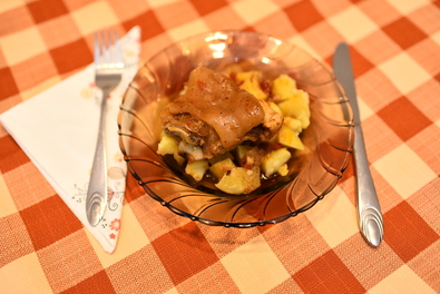 Hozzávalók: 2 disznóláb (sertésköröm), 2 piros kápia paprika, 2 zöldpaprika, 3 paradicsom, 2 fej fehérhagyma, 2 cikk fokhagyma, 1 dl olaj, só, 1–2 kiskanál bors, 2 kiskanál fűszerpaprika, 2 kiskanál ételízesítő; a körethez: 1 kg krumpli, só.