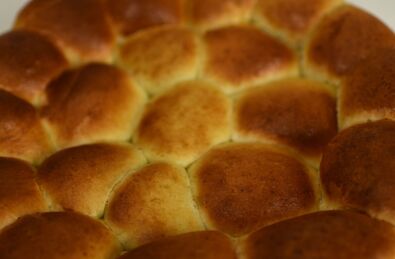 Az élesztőt belemorzsoljuk kevés langyos cukros tejbe és felfuttatjuk. Ezalatt a lisztet egy dagasztótálba szitáljuk, belekeverjük a sót és a cukrot, majd hozzáadjuk a vajat, a felfuttatott élesztőt, a maradék tejet meg a tojássárgáját és összegyúrjuk. A legvégén – amikor már összeállt a tészta – beledolgozzuk az olajat is. Ezután a tálat tiszta konyharuhával letakarjuk, és meleg helyen a tésztát duplájára kelesztjük. Miután megkelt a tészta, lapítóra borítjuk, két egyenlő cipóra osztjuk. A két cipót külön-külön kb. fél centi vastagra nyújtjuk és 7×7 cm-es kockákra vágjuk.