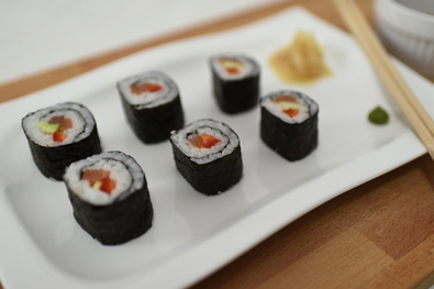 Hozzávalók: 20 dkg kerek szemű szusirizs, 3,5 dl víz, 0,6 dl rizsecet, 2,5 dkg cukor, 1,5 kiskanál só, 10 dkg filézett füstölt lazac, 1 kis kígyóuborka, 1 piros kápiapaprika, 1 avokádó, 3,5 dl víz, 4 algalap (norilap); a tálaláshoz: szójaszósz, wasabipaszta, illetve marinált, szeletelt szusigyömbér.