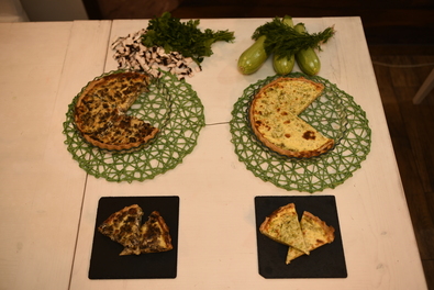 Összeállítjuk a kétféle quiche-t. Az egyik elősütött tészta alján egyenletesen eloszlatjuk a gombás tölteléket, ráöntjük a sodót, majd a műveletet megismételjük a másik elősütött tésztával és a cukkinis töltelékkel. A kétféle töltelékkel töltött quiche-t 180 Celsius-fokon kb. fél óra alatt készre sütjük. Amikor a quiche tetején a sodó megkötött, gazdagon megszórjuk reszelt sajttal, majd visszatesszük a sütőbe, hogy a sajt is ráolvadjon, megpiruljon.