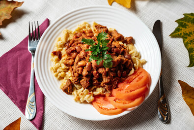 A csilis-paszulyos borjúragut a kifőtt csipetkével tálaljuk, de a csipetkét akár bele is főzhetjük a raguba.