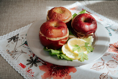 Elkészítése: Az almák száras végéről levágunk egy szeletet, magházukat eltávolítjuk, és a gyümölcsök húsát kikaparjuk úgy, hogy kb. 1 cm vastag faluk maradjon. A kivájt almákat a „kalapokkal” együtt citromos vízbe tesszük addig, amíg elkészítjük a tölteléket.