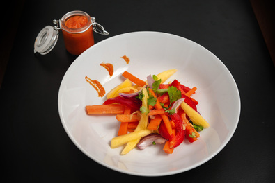 A salátához a mangót, a murkot és a paradicsompaprikát julienne-re, azaz gyufaszál vastagságúra aprítjuk, a hagymát pedig laskára vágjuk. A felszeletelt zöldségeket egy tálba halmozzuk, megszórjuk finomra vágott petrezselyemzölddel vagy korianderlevéllel, és összekeverjük. Tálaláskor csiliszószt és citromlevet keverünk a salátához.