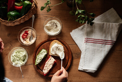 Külön tálacskákba, illetve félbevágott paprikákba tesszük a háromféle színű és ízesítésű körözöttet és friss kenyeret tálalunk hozzá.