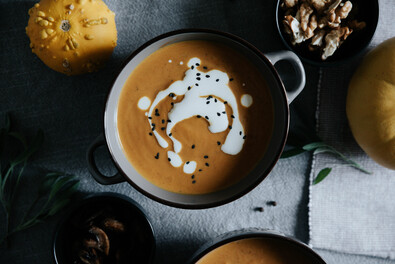 Hozzávalók: 1 kis sütőtök, 1 hagyma, 4 cikk fokhagyma, 2 evőkanál vaj, 1 doboz 20 százalékos főzőtejszín (2,5 dl), 1,5 l húsalaplé (vagy 1,5 l víz és 1 húsleveskocka), 3 zsályalevél, 1 kiskanál őrölt szerecsendió, késhegynyi fahéj, só, bors, méz; a tálaláshoz: fekete szezámmag.
