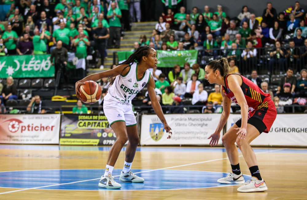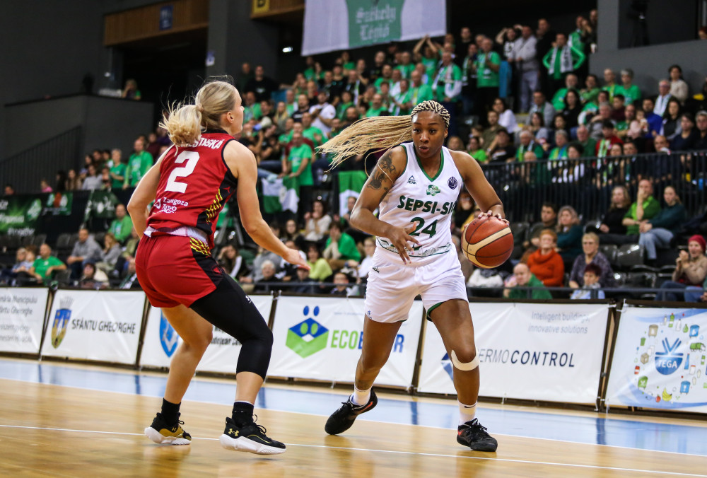 Az amerikai Courtney Range leigazolása után további két játékos érkezéséről adott hírt a Sepsi-SIC: a zöld-fehérek előbb Ecaterina Armanu szerződtetését, majd a Zaragoza elleni meccs napján Jovana Pašić visszatérését jelentették be. Zoran Mikes edző előbbit igen, utóbbi kettőt viszont nem nevezte a spanyolok elleni mérkőzésre, amelyet a házigazda sepsiszentgyörgyiek kezdtek jobban, lányaink Gereben és Hrisztova vezényletével 19–11-re nyerték meg az első negyedet. A másodikat egy vendégtripla nyitotta meg, többszöri kosárváltás után Range is pontosan célzott távolról, és a 24. percben 10 pontos volt a SIC előnye (28–18). A folytatásban mindkét oldalon több ziccer is kimaradt, és 34–27-es állásnál vonultak szünetre a csapatok.