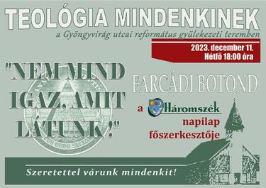 Ma 18 órától a Gyöngyvirág utcai református templom gyülekezeti termében Farcádi Botond, a Háromszék főszerkesztője Nem mind igaz, amit látunk címmel tart médiaismereti előadást a Teológia mindenkinek sorozat részeként.