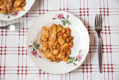 Hozzávalók: 1 csirkemell (40 dkg), 40 dkg főtt zöldborsó, 40 dkg csiperkegomba-konzerv, 1 fej fehérhagyma (vöröshagyma), 3 cikk fokhagyma, 1 kis kápiapaprika, 1–2 kis paradicsom, só, bors, 2 kiskanál pirospaprika (fűszerpaprika), 2 kiskanál ételízesítő, 1 evőkanál zsír; az eresztékhez (habaráshoz): 3 evőkanál tejföl, 1–2 evőkanál liszt.