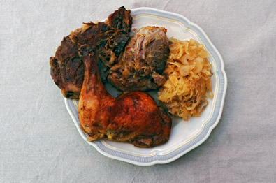 Hozzávalók: 1 egész csülök, 4 csirkecomb, 1 oldalas, 1 kg savanyú káposzta, 5 dl olaj, fűszerek ízlés szerint (só, bors, fokhagymapor, szárnyas fűszersó, fűszerpác).