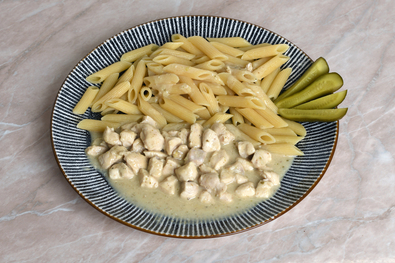 Elkészítése: A csirkemellet megmossuk, kicsontozzuk, leszedjük a hártyákat, és kis kockákra vágjuk. A hagymát apróra vágjuk és az olajon megdinszteljük. Rátesszük a csirkehúst és enyhén megpirítjuk. Amikor kevés levet engedett, sózzuk, borsozzuk és fedő alatt fehéredésig pároljuk. A mustárt elkeverjük a tejszínnel, beletesszük a majoránnát, sózzuk, borsozzuk, habverővel simára keverjük. Amikor a hús kicsit megpuhult, hozzáadjuk a mustáros tejszínt és folytonos kevergetéssel besűrítjük. A tésztát sós vízben kifőzzük, rászedjük a szaftos húst és savanyú uborkával tálaljuk.