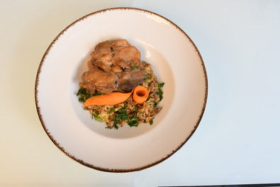 ElkészÃtése: A csirkecombokat besózzuk, kb. 4 evÅ‘kanál szójaszószban megforgatjuk, majd hűtÅ‘ben egy órát pihentetjük. A zöldségeket megtisztÃtjuk és vékony csÃkokra vágjuk. Egy mélyebb serpenyÅ‘ben olÃvaolajon kissé megpirÃtjuk a combokat (mindkét oldalát 2–2 percig), majd kivesszük. Ebben a zsiradékban feltesszük a felaprÃtott újhagymát, fokhagymát, vöröshagymát és a gyömbért, és megpirÃtjuk (de nem égetjük el!). Amikor megvan, visszatesszük rá a combokat, felöntjük az alaplével, hogy majdnem ellepje, lefedjük, és kis lángon gyöngyözve fÅ‘zzük kb. 40 percig. Mikor puhára fÅ‘tt, a húst kiszedjük és tálalásig melegen tartjuk. A rizst sós vÃzben megfÅ‘zzük. A felaprÃtott zöldségeket (répa, petrezselyem, cukkini, paprika, gomba) forró olajon megpirÃtjuk, rátesszük a fÅ‘tt rizst, átforgatjuk, és 5 percig pirÃtjuk. Ráütjük a tojásokat, majd hozzáadunk négy evÅ‘kanál szójaszószt és az egészet összeforgatjuk, a tojás megszilárdulásáig sütjük. Tálaláskor a rizsre teszünk egy combot és petrezselyemlevéllel dÃszÃtjük.
