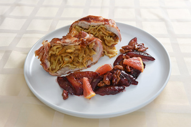 Hozzávalók: 6 db csirkecombfilé, 25 dkg tészta (fodros kocka), 1 fej káposzta, 24 vékony szelet baconszalonna, 1,5 dl balzsamecet, 1 dl vörösbor, 15 dkg dió, 4 evőkanál méz, 1 db grépfrút, 1 kg szilva, 1,5 dl olaj, 15 dkg cukor, 5 teáskanál só, 2 teáskanál őrölt bors.