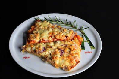 Hozzávalók – a tésztához: 0,5 kg liszt, 5 dkg élesztő, 1 teáskanál cukor, 2 dl tej, 1 tojás, 1 csipet só, 1 evőkanál olaj; a feltéthez: 1 tubus pizzakrém (160 gr), 25–30 dkg szeletelt sonka, 1 doboz konzervkukorica (25–30 dkg), 1 üveg gomba (15 dkg), 1 doboz konzervananász (50 dkg), 1 fej lila hagyma, 40 dkg sajt, 1 mokkáskanál fokhagymakrém, 2–3 evőkanál tejföl.