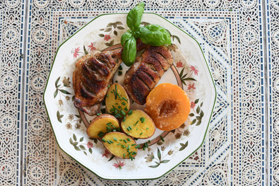 Elkészítése: A húsokat megmossuk, lecsepegtetjük, éles késsel a bőrét bevagdaljuk. Mindkét oldalát megszórjuk sóval, borssal, majd olasz fűszerkeverékkel, végül mézzel megcsurgatjuk-bekenjük. Betesszük a hőálló zacskóba, kiszippantjuk a levegőt, lezárjuk, betesszük a szuvidálókészülékbe és kb. 2 órán keresztül szuvidáljuk. Amikor kész, kivesszük a zacskóból, tepsibe tesszük, ráöntjük a levét is, és letakarva 20 percet pihentetjük. A krumplit megmossuk, félbevágjuk, megsózzuk, beolajozzuk és a hús köré rendezzük. 200 Celsius-fokos sütőben 30–40 percig sütjük. Tálaláskor félbevágott őszibarack-befőttet kínálunk mellé.