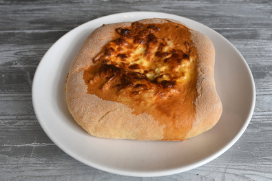 Amikor megkelt a tészta, tetejére kevés lisztet szórunk, majd liszttel felszórt gyúródeszkára téve kilapítjuk. Az így kapott korong közepére sajtot szórunk, amit aztán becsomagolunk a korong széleivel, majd ismét korong alakúra lapítjuk. Az így kialakult korong közepébe lyukat csípünk, bekenjük felvert, vízzel kevert tojássárgájával és tetejére sajtot szórunk. Serpenyőben vagy sütőben 180 fokon megsütjük.