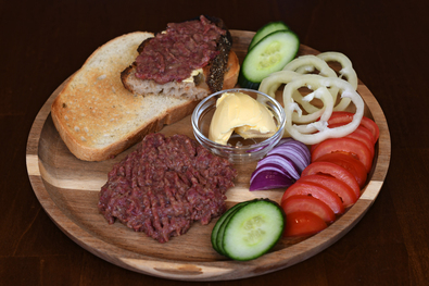 Elkészítése. A húst darabokra vágjuk és ledaráljuk. A vöröshagymát megtisztítjuk és a reszelő legkisebb részén lereszeljük – a levét is felfogjuk. Lapos tálban szétterítjük a húst, befűszerezzük, a fokhagymát ráreszeljük, rátesszük a mustárt, hagymát, olajat, pár csepp Worcester-szószt, és villák segítségével egyenletesen összekeverjük, ügyelve, hogy mindenhova kerüljön fűszer. Átkeverjük, majd fél órára hűtőbe tesszük. Pirítós kenyérre kenve, a tojások sárgájával kínáljuk és friss, nyers zöldségeket adunk mellé.