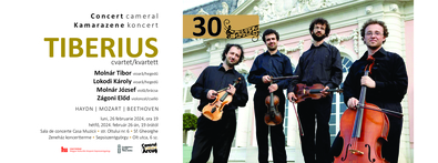 Ma 19 órától Sepsiszentgyörgyön az Árkosi Kulturális Központ kocerttermébe kamarazene-hangversenyre várja a közönséget a 30. születésnapját ünneplő marosvásárhelyi Tiberius vonósnégyes: Molnár Tibor (I. hegedű), Lokodi Károly (II. hegedű), Molnár József (brácsa), Zágoni Előd (cselló). Egy jegy ára 20 lej.