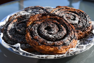 Elkészítése. Az élesztőt feloldjuk a tejben. A lisztet beletesszük az edénybe, hozzáadjuk a margarint, utána megsózzuk. Ezután beletesszük a cukrot és jól összekeverjük. A tojást hozzáadjuk az élesztőhöz, és beletesszük a lisztbe. Géppel elkezdjük dagasztani, és óvatosan hozzáöntjük a langyos tejet. Egynemű masszává dagasztjuk. Lisztezett deszkán kicsit kinyújtjuk, a közepére tesszük a margarint, becsomagoljuk és nyújtófával megdöngöljük, hogy mindenhova jusson zsiradék. Elforgatjuk, nyújtjuk, lisztezzük. A széleitől kezdve összehajtogatjuk, nyújtjuk, lisztezzük. A hajtogatás után fóliával letakarva fél órát pihentetjük. Újra nyújtjuk, hajtogatjuk és letakarva pihentetjük. Mikor levelesre hajtogattuk, lisztezett deszkán téglalap alakúra nyújtjuk. Vékonyan bekenjük sima vízzel, majd egyenletesen elterítjük rajta a kakaós cukrot. Megspricceljük vízzel, majd feltekerjük. A végét nem kakaózzuk meg, hogy összeragadjon. A tepsit beolajozzuk. Éles késsel egyforma vastagságú szeleteket vágunk a tekercsből. A tetejét megkakaózzuk, kicsit szétnyomkodjuk, hogy lapos legyen, és a tepsibe fektetjük. 15–20 percre a kelesztőbe tesszük. Előmelegített légkeveréses sütőben 190 Celsius-fokon 15 percig sütjük. Tálalás előtt porcukorral megszórjuk.