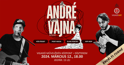 André Ferenc és Vajna Ádám költők zenés irodalmi & spoken word műsora március 12-én, kedden 18 órától Kézdivásárhelyen a Vigadó Művelődési Központ dísztermében lesz műsoron. Az AndréVajna produkció erdélyi nagyturnéja március 13-án, szerdán Sepsiszentgyörgyön a Bod Péter Megyei Könyvtár Gábor Áron-termében zárul, ahol 18 órakor kezdődik az előadás, melyet Szabó Eszter modereálásával rövid irodalmi beszélgetés előz meg.