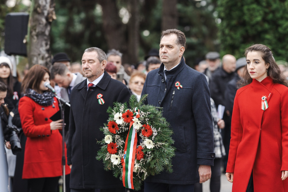 Tóth-Birtan Csaba, Antal Árpád és Vargha Fruzsina koszorúznak. Fotó: Facebook / RMDSZ – Háromszéki Területi Szervezet