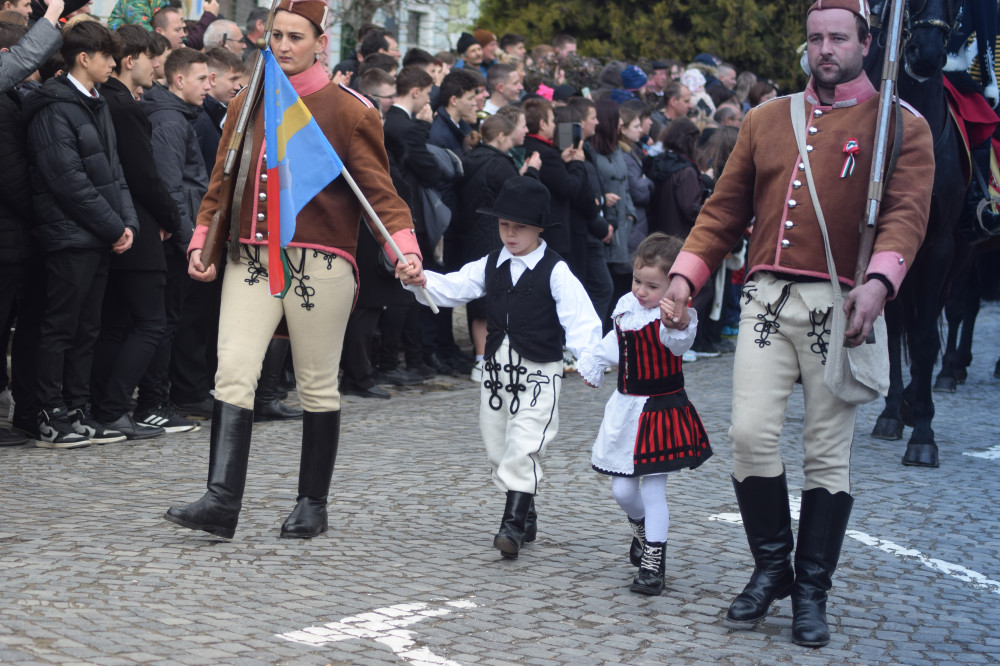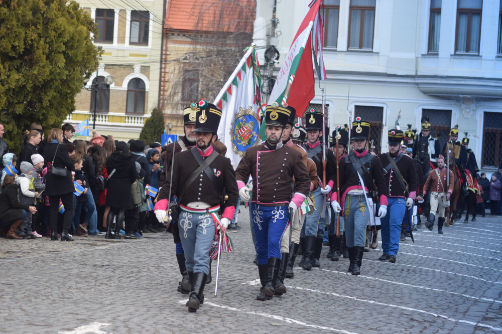A felvonulást az iskolák képviselői indították, majd civil szervezetek és a Történelmi Vitézi Rend következett. Ezután a Rákóczi induló akkordjaira felvonult a Kézdiszéki Huszár Hagyományőrző Egyesület – 15-ös, II. Székely Határőr Gyalogezred Kézdiszéki csapata, a Nagy Mózes Közművelődési Egyesület 15-ös Székely Határőr Gyalogezred, 1-es zászlóalj kézdivásárhelyi hagyományőrző csapata, a 15-ös, II. Székely Határőr Gyalogezred gelencei csapata, a bélafalvi Tuzson János Hagyományőrző Társaság, a 15-ös, II. Székely Határőr Gyalogezred összevont kézdiszéki csapata, valamint a tápióbicskei tüzérek. A Kézdiszéki Huszár Hagyományőrző Egyesület, 11-es Székely Határőr Huszárezred csapatát Pál Olivér hagyományőrző huszár hadnagy vezette. Néhány éves hagyomány lett Kézdivásárhelyen az is, hogy a gyalogosok és a huszárok tisztelegnek az elöljáróknak bevonulásuk után a Gábor Áron-szobor mögött, majd zászlójukra szalagot kapnak. A szalagokat idén Bokor Tibor polgármester, Fejér László Ödön és Tánczos Barna szenátor, valamint Szilveszter Szabolcs alpolgármester tűzték fel a hagyományőrzők lobogóira.