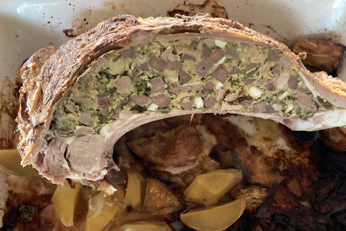 A töltött bárányt – miután teljesen kihűlt – éles késsel a csont mentén szeleteljük, lerben sült rozmaringos krumplival tálaljuk.