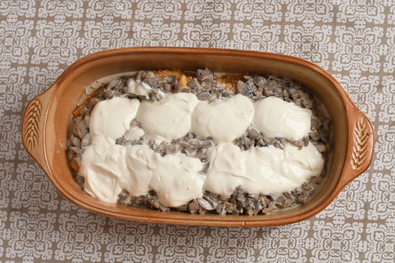 Elkészítése. A csirkemelleket kiklopfoljuk, besózzuk, beleforgatjuk lisztbe, tojásba és forró olajban megsütjük. A hagymát apróra vágjuk, olajon megdinszteljük, rátesszük a gombát, sózzuk, borsozzuk, megszórjuk ételízesítővel és lefedve megpároljuk. Ha megpuhult, levesszük a fedőt, elfőzzük a levét és hozzáadjuk a tejfölt, majd összeforraljuk vele. Egy cseréptálba rétegezzük a gombát, a hússzeleteket, majd újra gombát, végül tejföllel meglocsoljuk. Rátesszük a tál tetejét és 40 percig fatüzelésű sparheltben sütjük. Hagyományos sütőben 180 °C-on alsó-felső módban süthetjük. Párolt rizzsel tálaljuk.