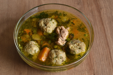 Elkészítése. Kevés olajon megdinszteljük a húst a zöldséggel. Fűszerezzük és azzal is összepároljuk, majd felöntjük vízzel, hogy ellepje. A gomócokhoz 1 fej összevágott vöröshagymát kevés olajon megdinsztelünk. A májat lekaparjuk a hártyáról és hozzáadunk egy mokkáskanál szódabikarbónát, a tojásokat, a megdinsztelt hagymát, zsemlemorzsát, olajat, petrezselymet, és alaposan összedolgozzuk, diónyi gombócokat formálunk belőle. Amikor a leves megfőtt, beletesszük a borsót, a petrezselymet és a gombócokat, és rövid idő alatt összefőzzük.